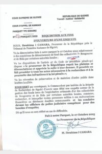 Le 7 octobre 2025, le procureur de la République près le tribunal de première instance de Siguiri a instruit au commandant par intérim de la brigade de recherche de Siguiri à l’ouverture d’une enquête autour de la gestion des fonds issus de l’exploitation artisanale d’or des collectivités de Bougourou et de Bida par dit-il certaines autorités locales. Cette réquisition aux fins d’ouverture d’enquête signée par M. Ibrahima Camara, procureur de la République près le tribunal de première instance de Siguiri ordonne également la recherche et l’interpellation de toute personne mêlée à ces malversations financières au détriment desdites communautés.