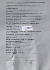 Dans la mine de Komondon située dans la localité de Bougouroun à cheval avec Setiguiya, le rapport révèle une recette de 11 000 000 GNF [1 268 USD] à date du 9 juin 2025. « Après tout, ils ont fait aussi deux mois d’activités sans compte rendu », peut-on lire dans ce rapport ci joint.