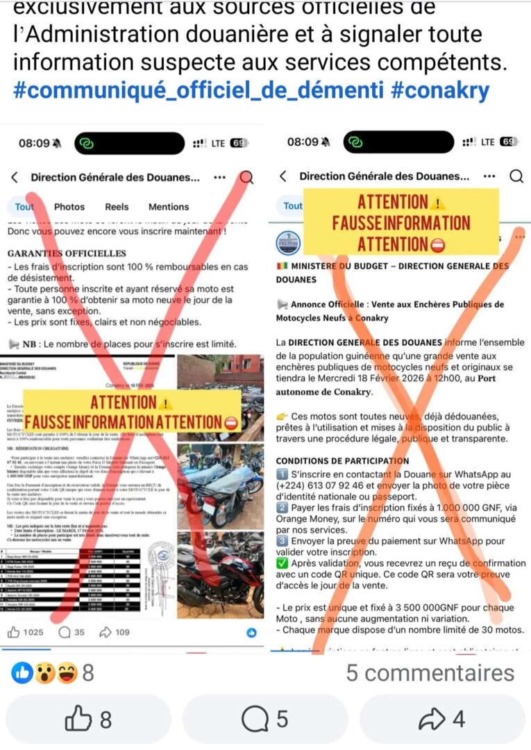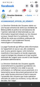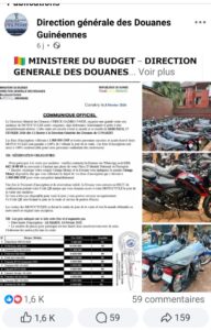 Au début du mois de février, une page dénommée sur Facebook « Direction des douanes guinéennes », annonçait à travers un communiqué une supposée vente aux enchères publiques des motocycles neufs à Conakry. Une publication qui a généré à plus de 1 600 likes, 58 commentaires et 159 partages.