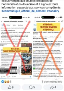A retenir : face à une information ou une annonce de ce type, ne vous précipitez pas pour la croire. Vérifier auprès de la direction générale de la douane à Conakry ou voir si l’annonce a été publiée par une source officielle de l’Etat. Car les fabricants de fake news empruntent aussi les noms des structures pour manipuler l’opinion.
