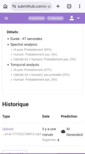 Alpha Blondy n’a pour le moment chanté aucune chanson pour la mémoire de Toumba. Cette chanson publiée et partagée sur les réseaux sociaux n’est pas du chanteur ivoirien. Elle serait plutôt générée par l’intelligence artificielle. C’est du moins, ce qui ressort de notre vérification avec cet outil. On a décidé d’approfondir avec cet autre outil qui révèle la probabilité de l’IA à 80%.