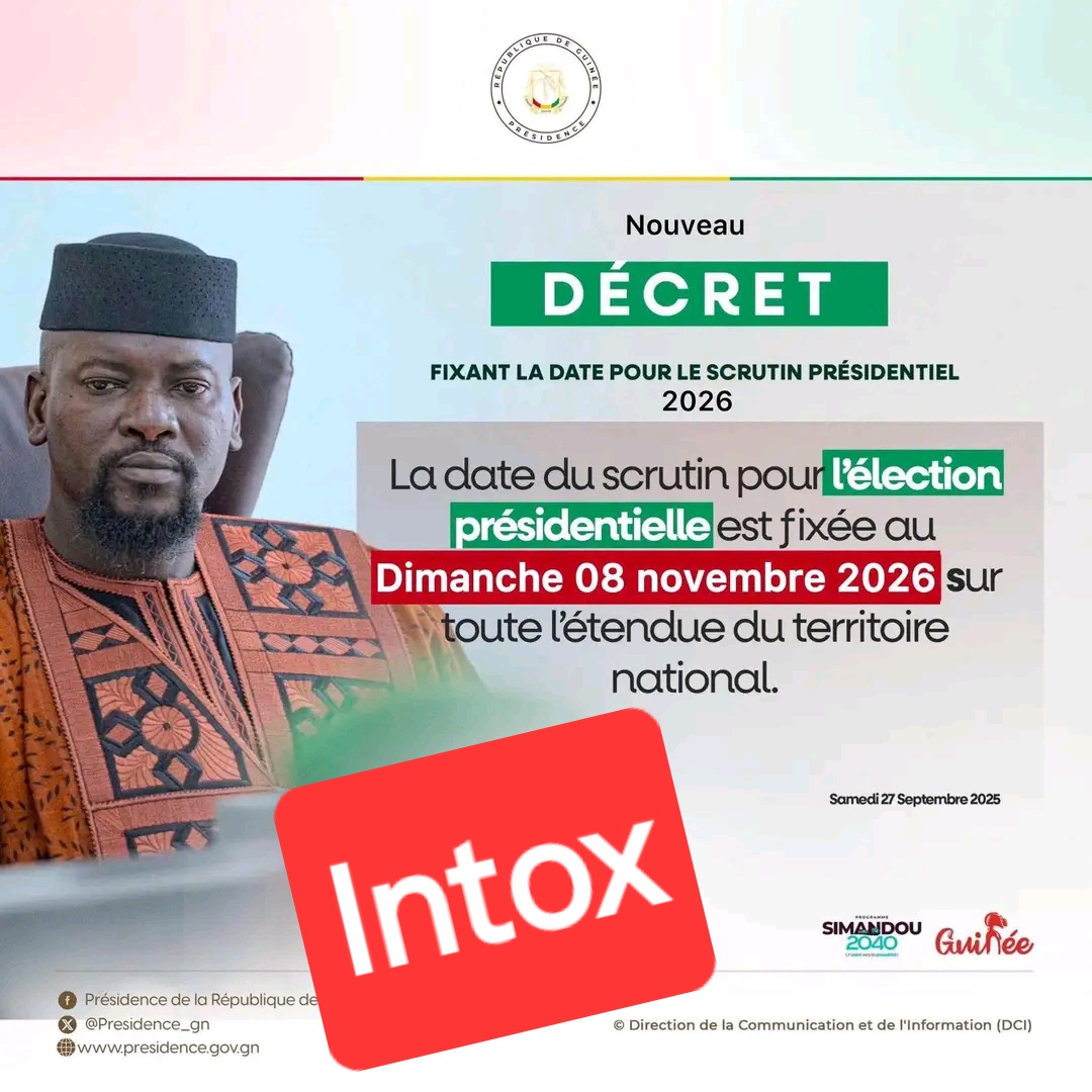 L’affiche d’origine avait été publiée le 28 septembre 2025 sur la page officielle de la présidence. Elle annonçait le premier tour de la présidentielle pour le 28 décembre. La version truquée reprend la même mise en page, mais change la date afin de semer la confusion.