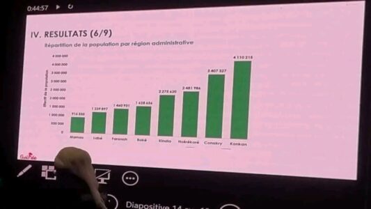 Les mêmes résultats indiquent que la région administrative de Kankan arrive en tête avec 4 110 215 habitants, suivie de Conakry avec 3 407 327.