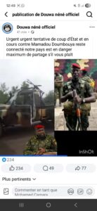 Le mercredi 18 février 2026, Douwa néné officiel publiait une vidéo sur Facebook accompagnée d’une légende relative à un prétendu coup d’Etat en Guinée. « Urgent urgent, tentative de coup d’Etat est en cours contre Mamadou Doumbouya. Restez connecter, notre pays est en danger. Maximum de partage s’il vous plait », peut-on lire sur la page.
