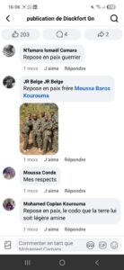 La photo associée à la vidéo est apparue dans une publication qui date du 19 janvier 2026 annonçant le décès d’un militaire guinéen. Parmi les commentaires, un internaute tague son nom : repose en paix frère Mamadi Baros Kourouma.