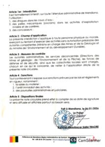 A travers cette décision, le préfet de Mandiana rappelle que tout contrevenant s’expose aux sanctions prévues par les lois et règlements en vigueur, notamment : la saisie du matériel, l’arrêt immédiat des activités et des poursuites administratives et judiciaires.